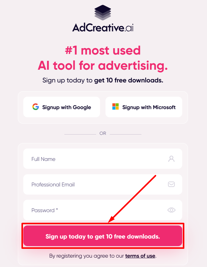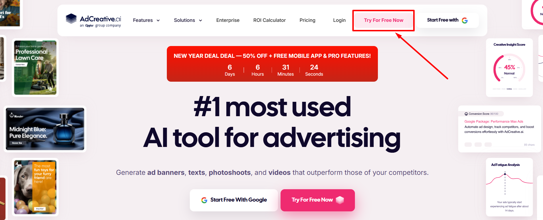 Step 1: Go to official website of AdCreative.ai and click on “Try For Free Now”.