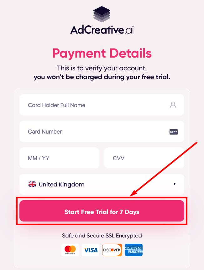 Step 3: Fill out your payment details and click on “Start Free Trial for 7 Days”.