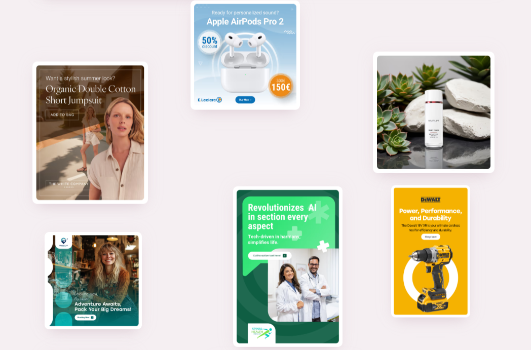 AdCreative.ai supports ad formats for Facebook, Instagram, Google Display, and similar platforms. Each creative follows platform-specific design and text rules.