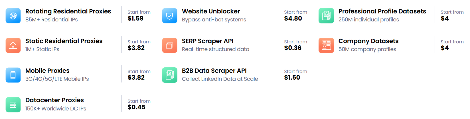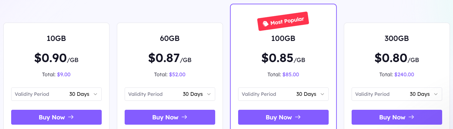 - Datacenter Proxies: High-speed proxies starting from $0.99/proxy, with unlimited traffic and one-day plans available.