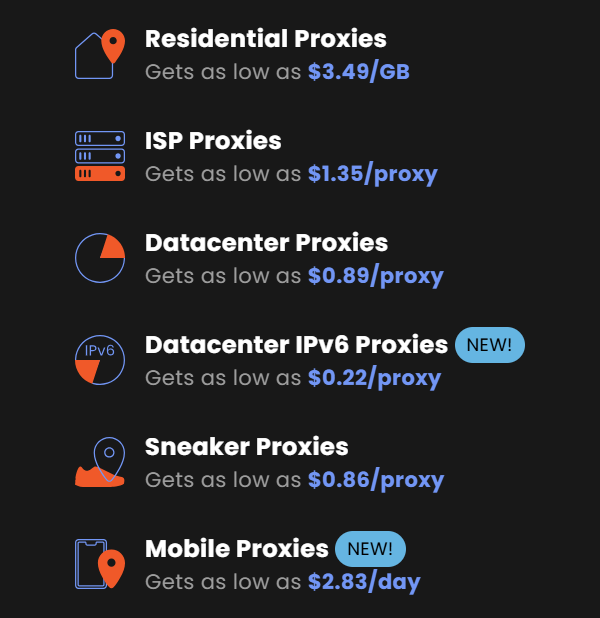 - Sneaker Proxies: Optimized for sneaker copping, starting from $0.90/proxy, with unlimited traffic and dedicated support for sneaker websites.
