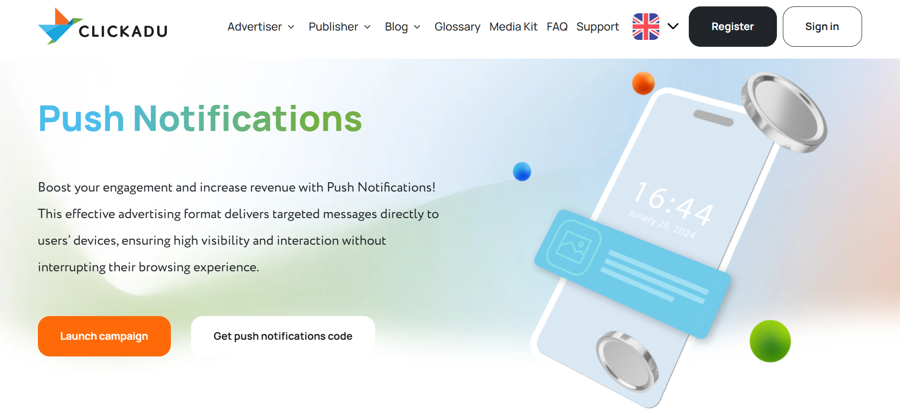 The platform focuses on delivering engaging push notifications and in-page ad formats that help businesses reach their target audience efficiently.