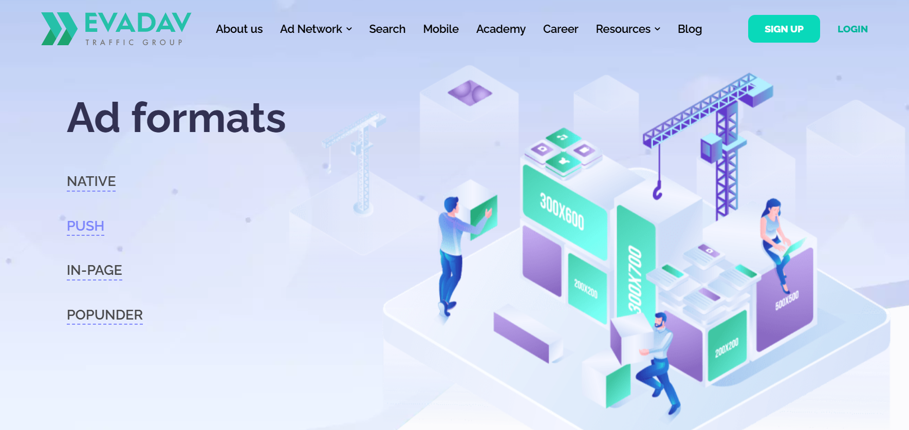 Supports push, in-page push, native, and popunder ads. Advertisers and publishers can choose the most effective format for their goals.