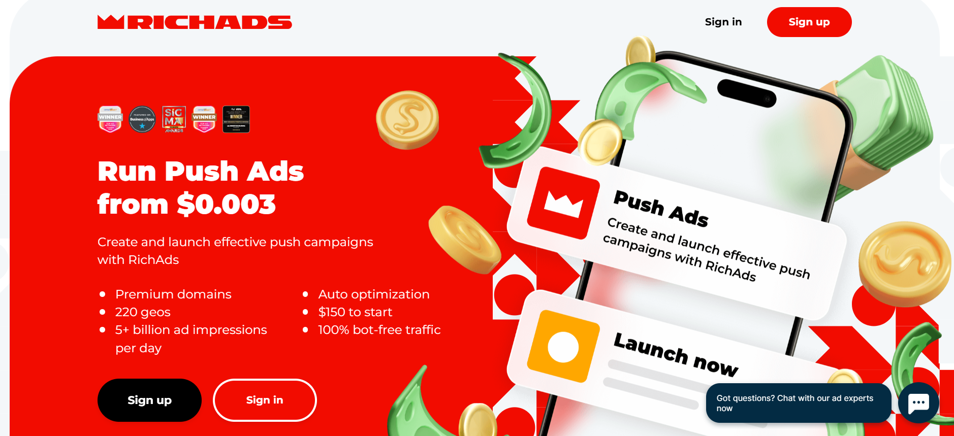 PropellerAds was one of the first platforms to introduce push notifications. Today, it delivers over 7 billion push impressions daily across global audiences. This makes it a top choice for high-volume, high-visibility campaigns.