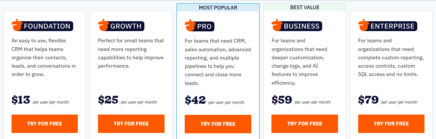 Designed for teams requiring sales automation, multiple pipelines, and advanced reporting. Includes customizable pipelines, personal email sequences, and full reporting suite. - Business ($59/user/month)