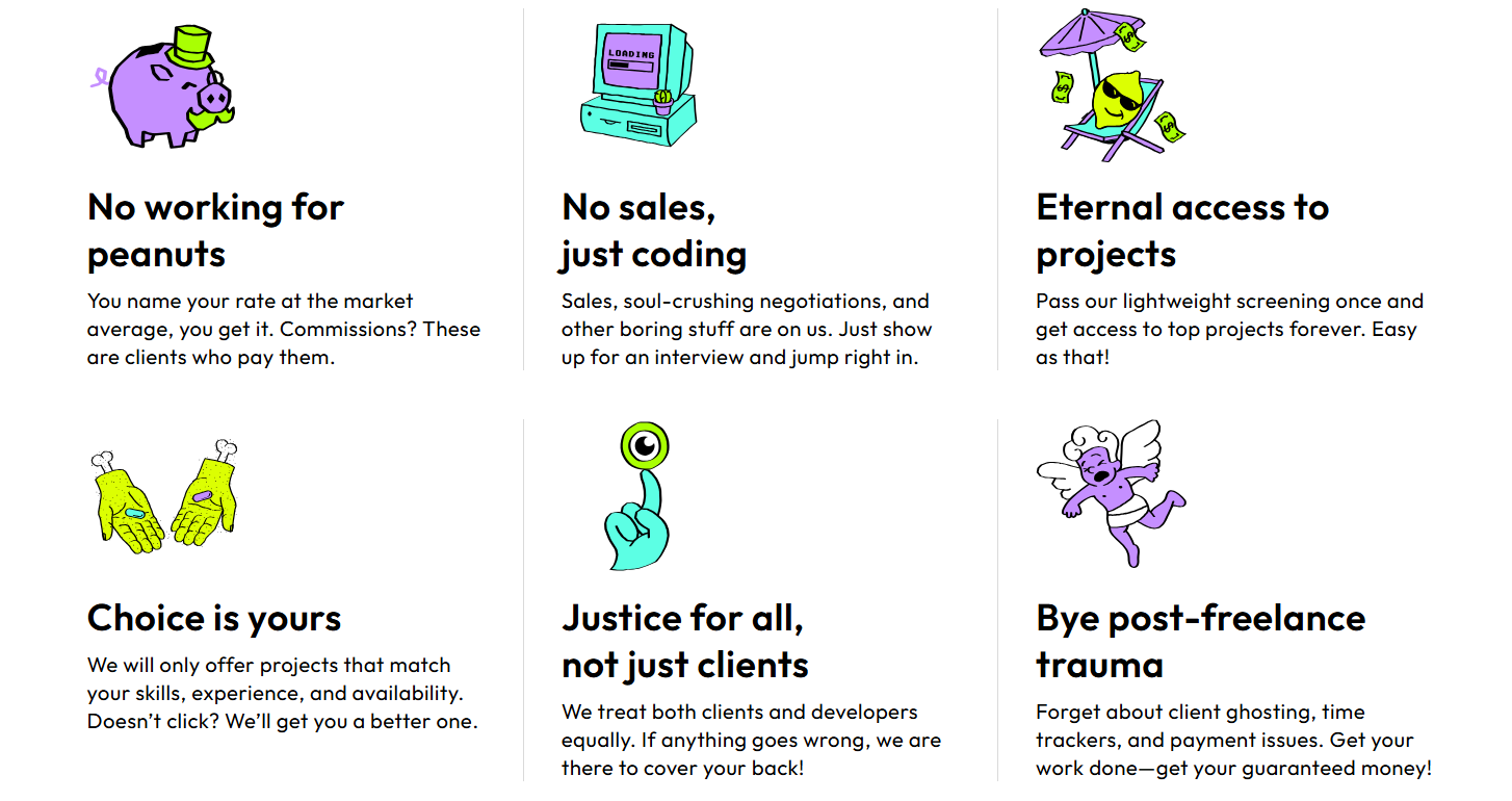 | Rigorously vetted developers ensure top 1% talent for projects. | Pricing is hourly and can be higher than general freelance platforms. |