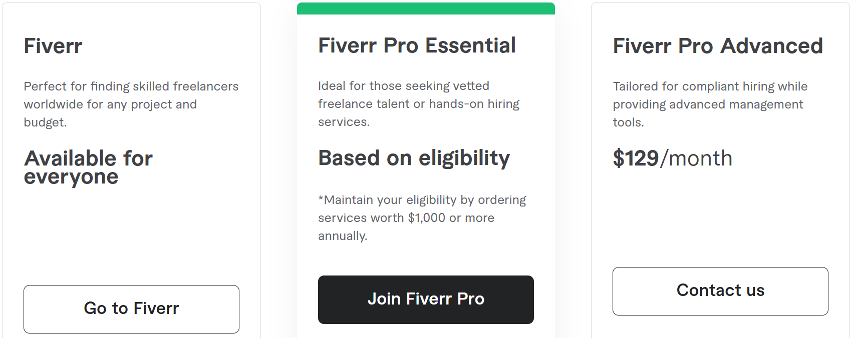 - Fiverr Pro Advanced ($129/month) : Tailored for compliant hiring with advanced management tools. Provides deferred payments, custom invoice reports, business analytics, and a dedicated Business Success Manager.