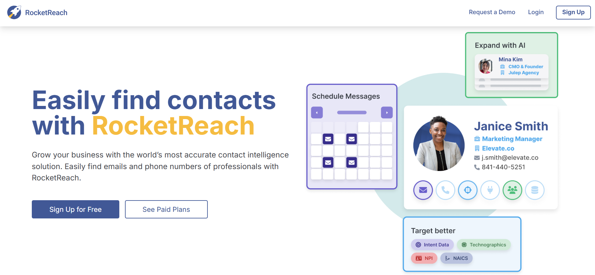 - Built-In Messaging & Integrations: Send emails directly from RocketReach using templates or AI writing, and sync data with tools like Salesforce, HubSpot, and Outreach.