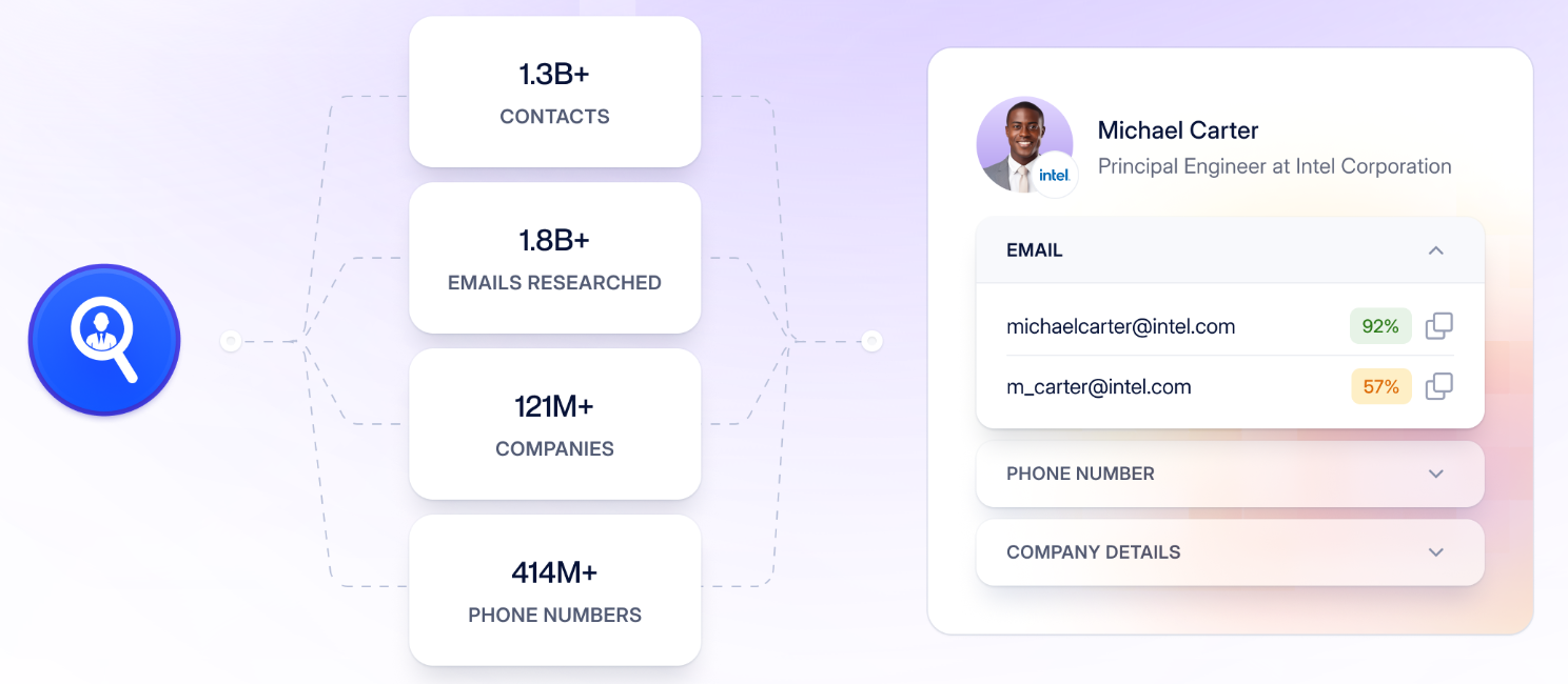 It researches and validates contact information across more than 1.3 billion business contacts and 121 million companies, allowing sales teams to reach decision-makers faster and with higher accuracy.