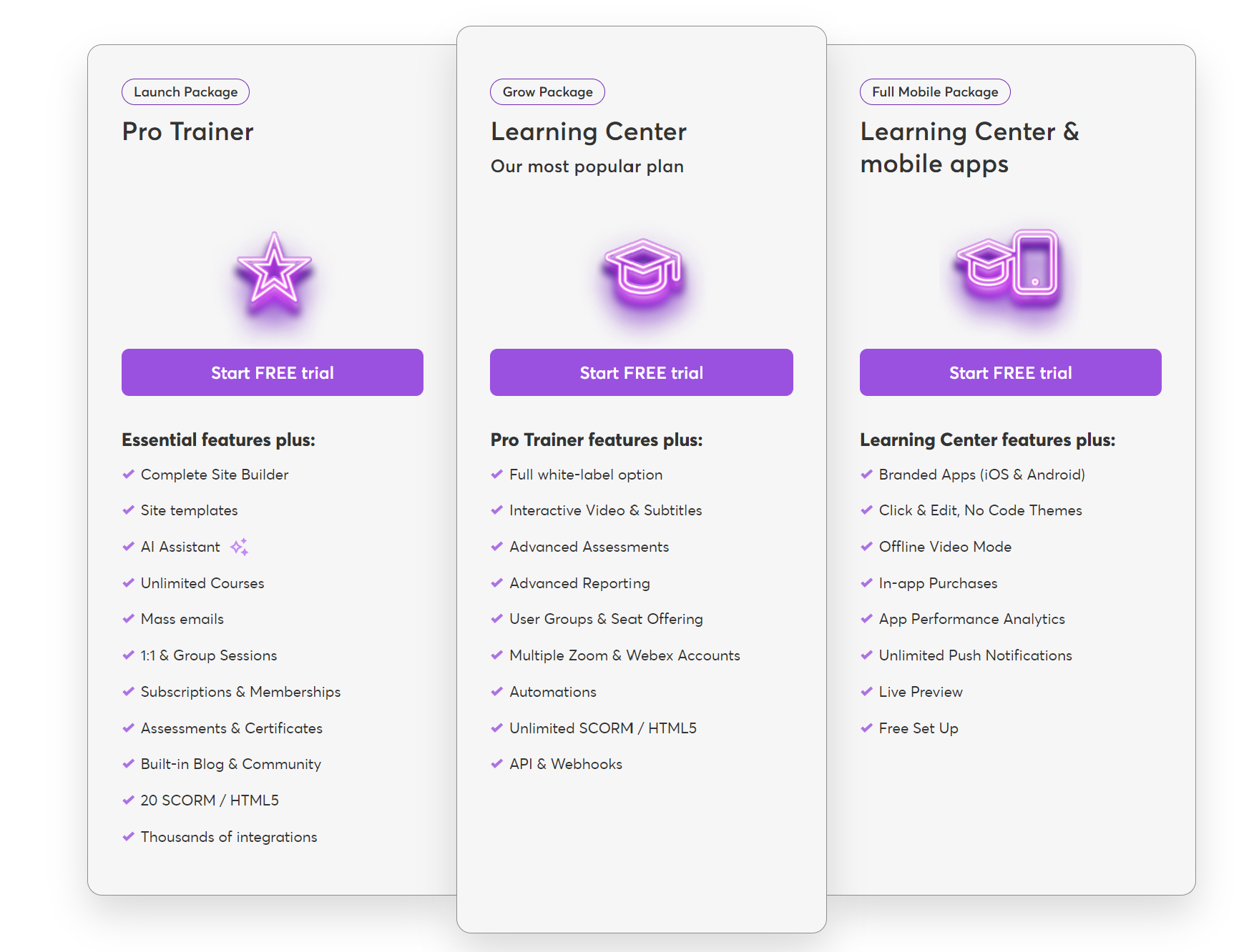 | Features | Pro Trainer | Learning Center | Full Mobile Package |