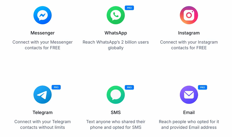 It works with Instagram, WhatsApp, Facebook Messenger, TikTok, SMS, and email.
