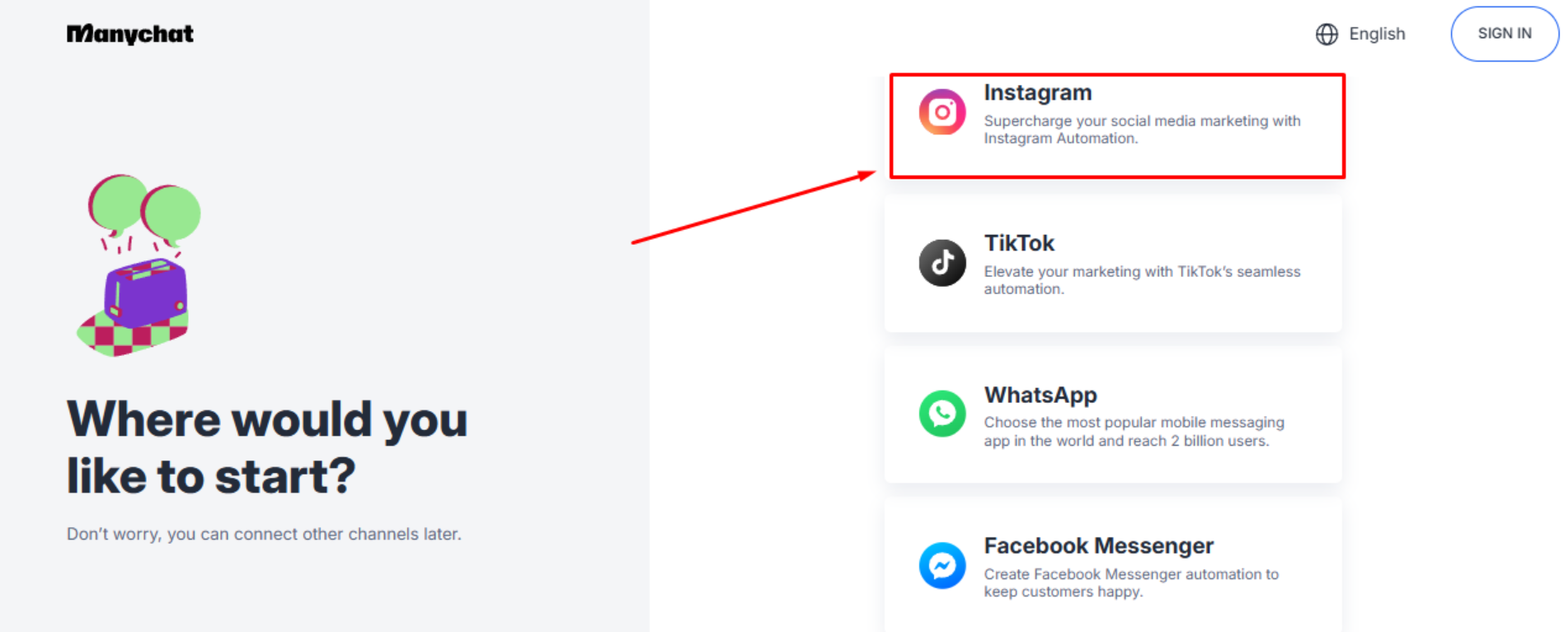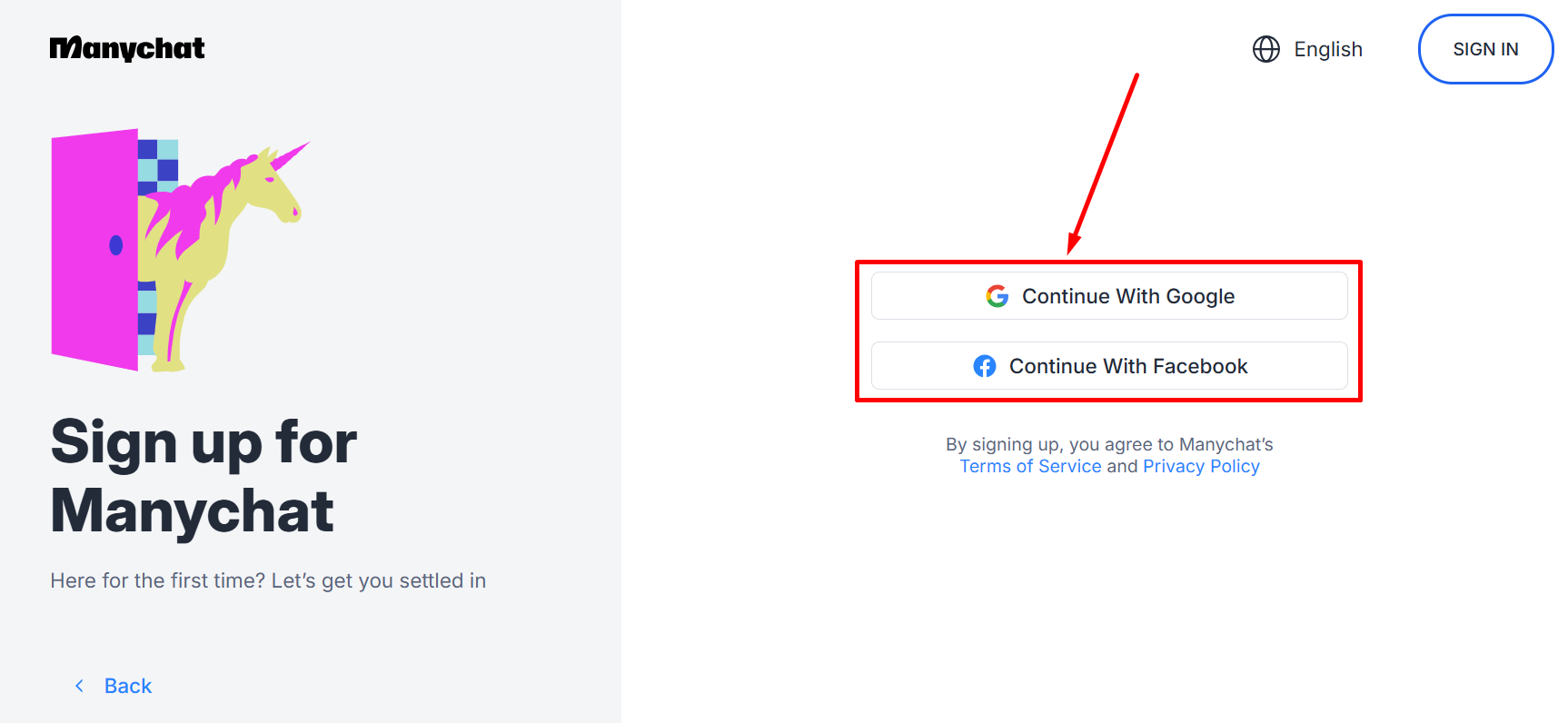 Step 2: Sign up for Manychat and continue with Google or Facebook.