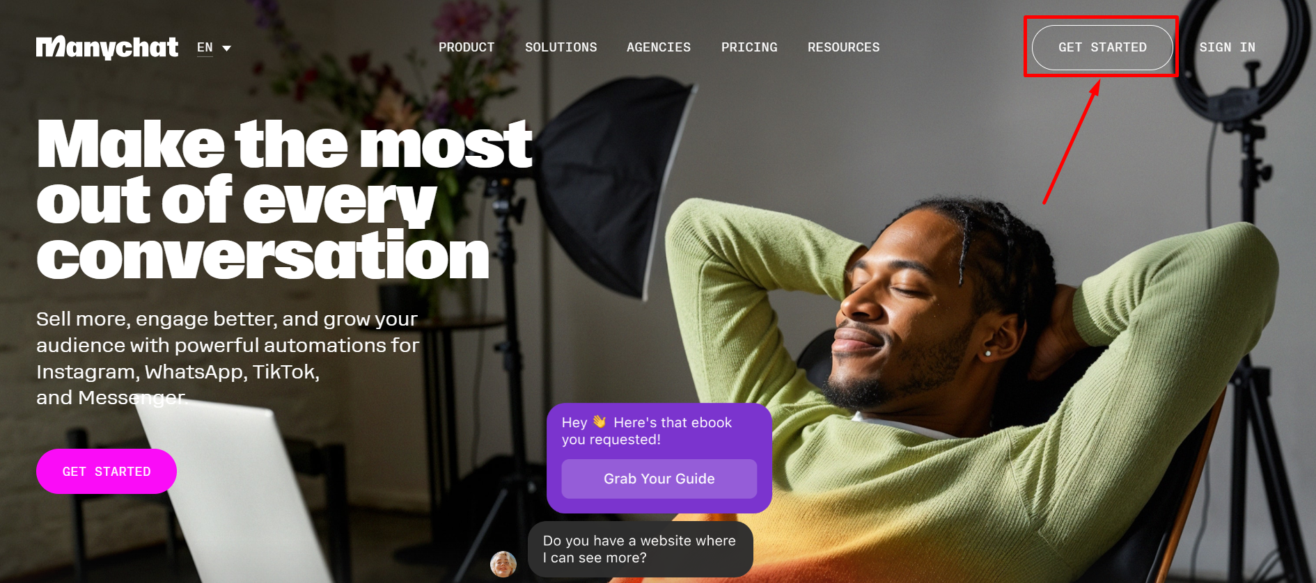 Step 1: Go to the official website of Manychat and click on “Get Started”.