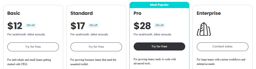 Pricing matches core plans, starting at $12/seat/month, with custom dashboards and integrations.
