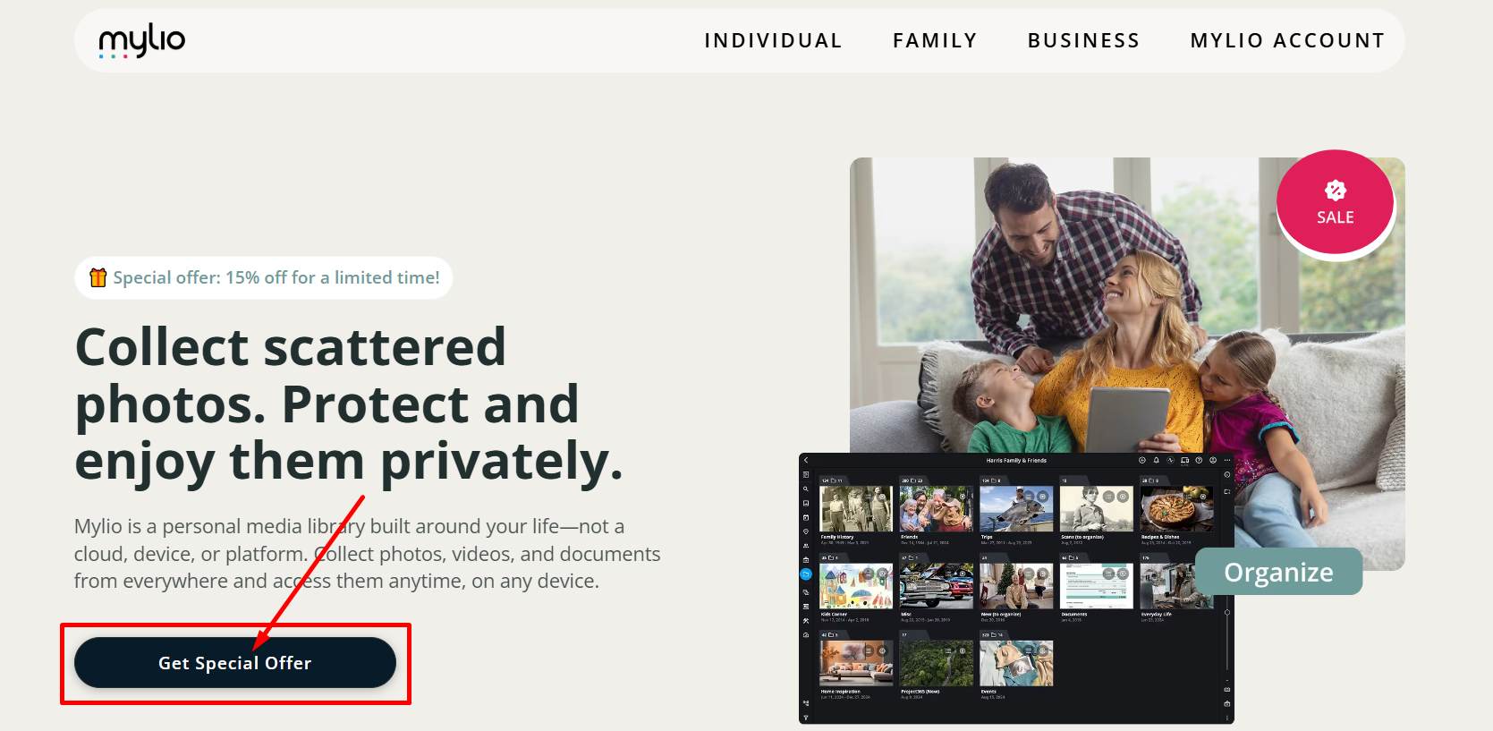Comes with automatic organization, AI face recognition, and a 15% discount with free onboarding.