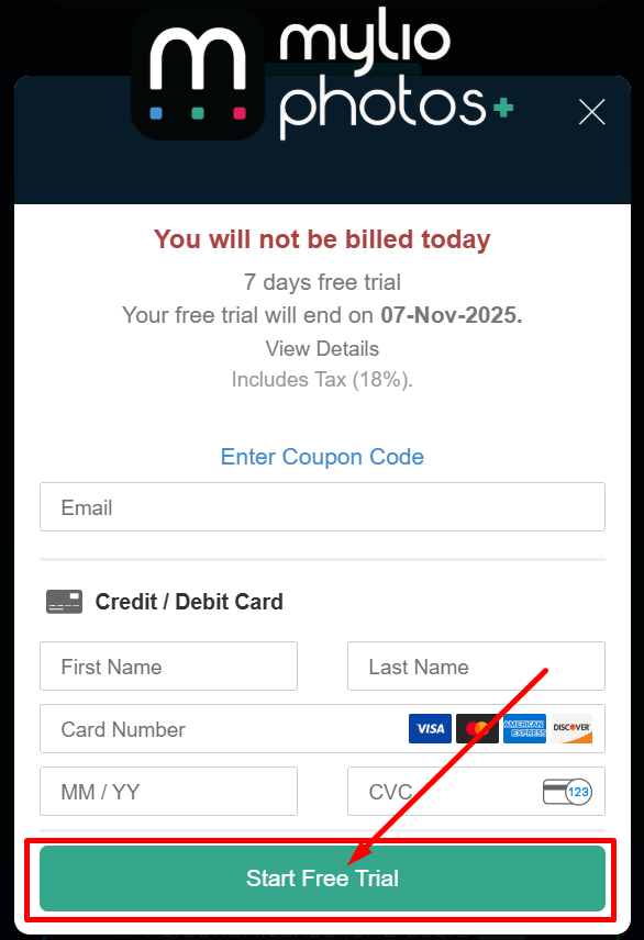 Step 4: Create your account by entering your email and filling credit information and then click on “Start Free Trial”.