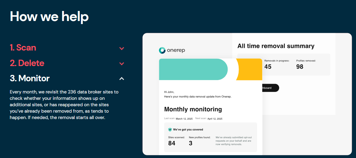 That’s where Onerep steps in. It promises to find, remove, and continuously monitor your personal information across hundreds of data broker websites.