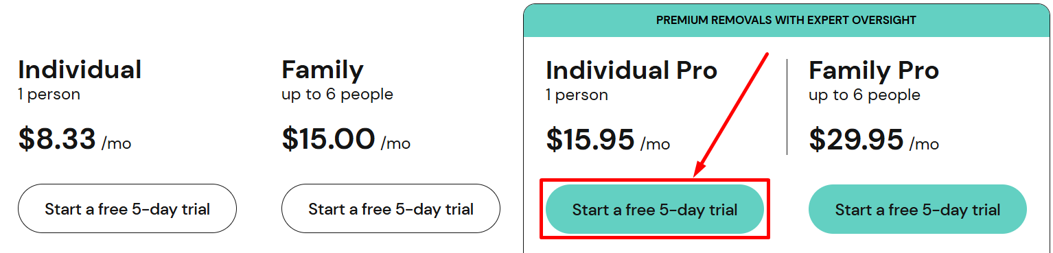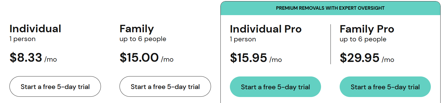 - Individual Pro — $15.95/month: Premium removals for 1 person with automation plus dedicated privacy expert and unlimited custom removal requests.