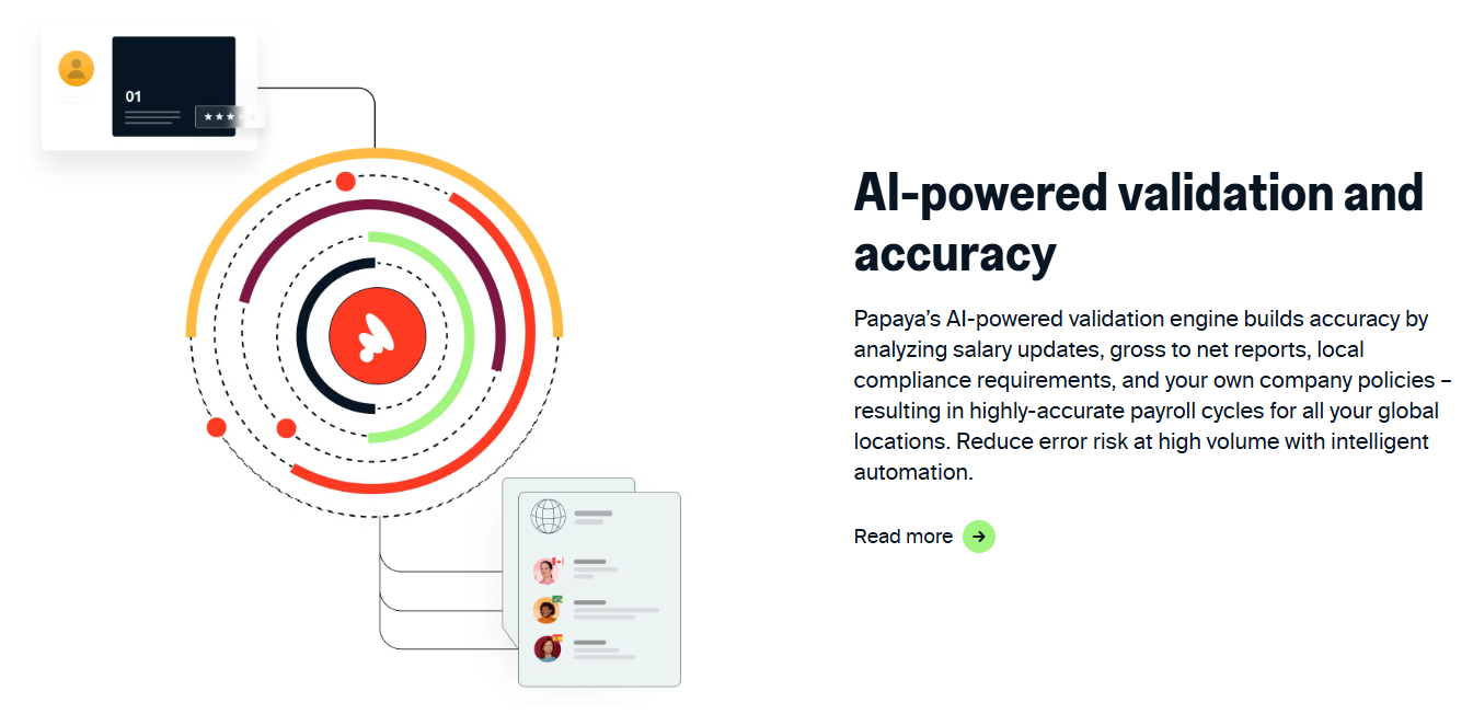 Papaya Global utilizes artificial intelligence and automation to handle repetitive tasks such as payroll calculations, compliance updates, and employee onboarding.