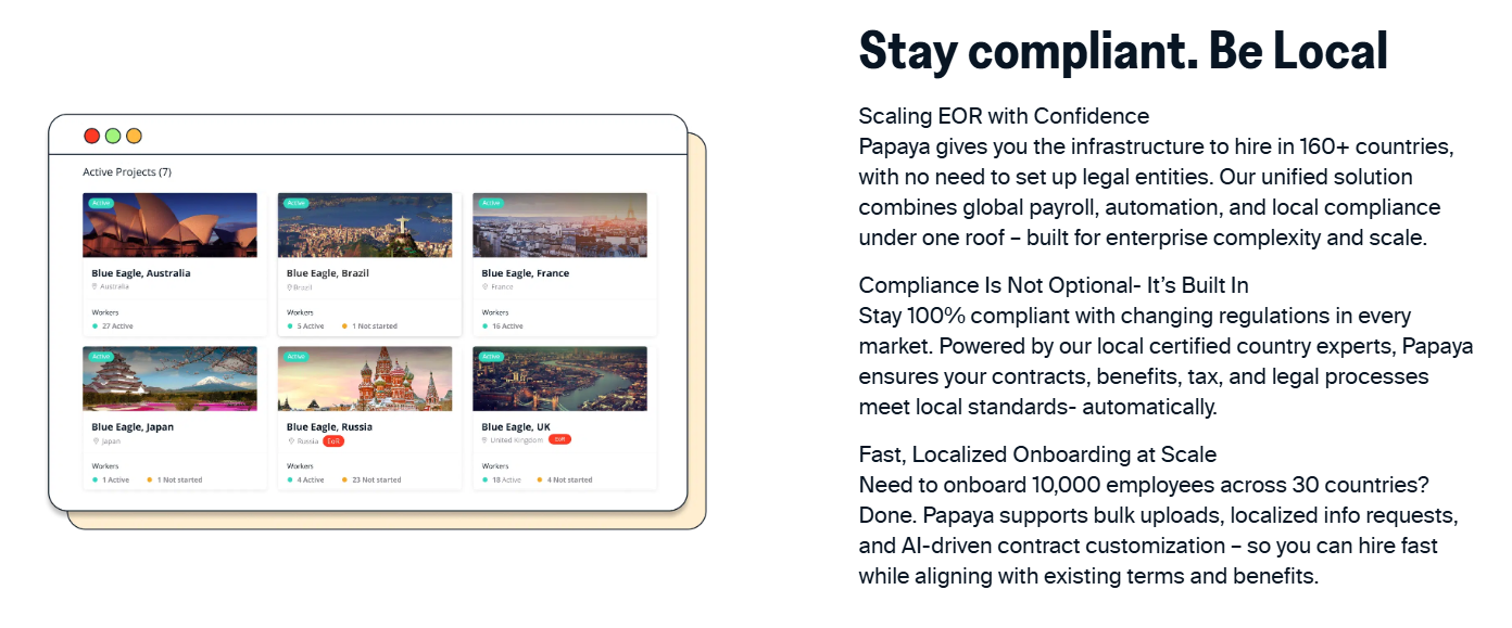 With Papaya Global’s EOR services, businesses can onboard employees quickly and stay compliant with international labor laws, ensuring smooth and fast transitions for new hires.