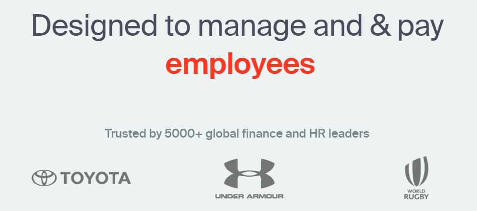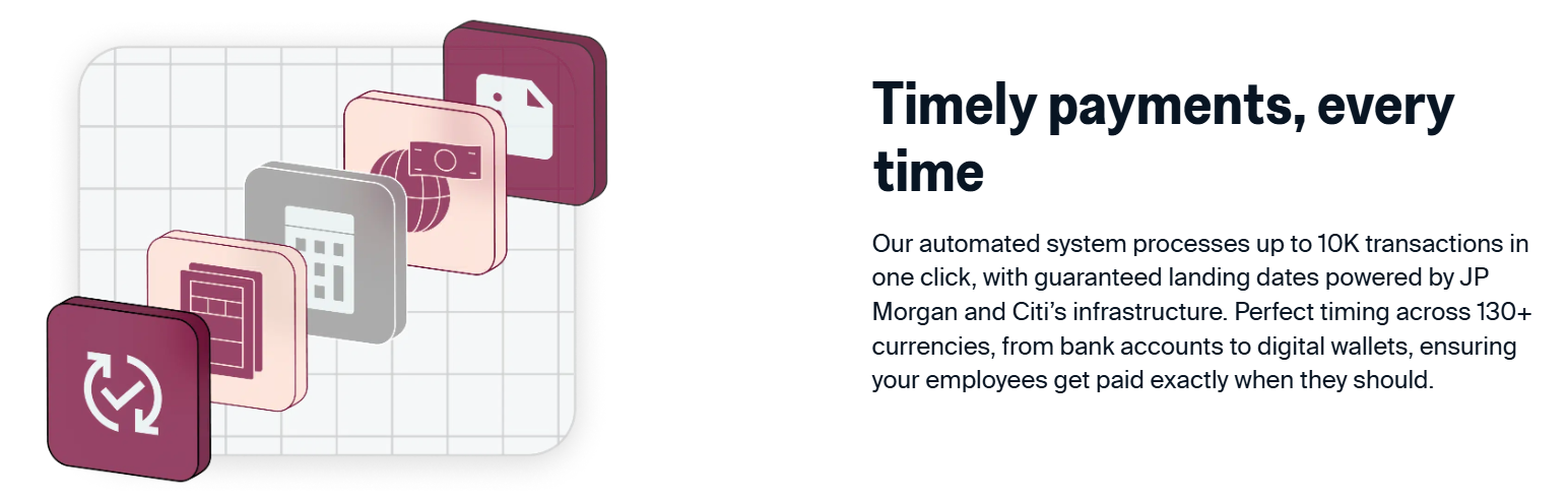 | Global Workforce Payments | $2.50/transaction | Payroll wallets in 14 currencies, bulk payments, financial data connectors, split payroll payments, authority payments, guaranteed payment date, account validation, fraud prevention. |