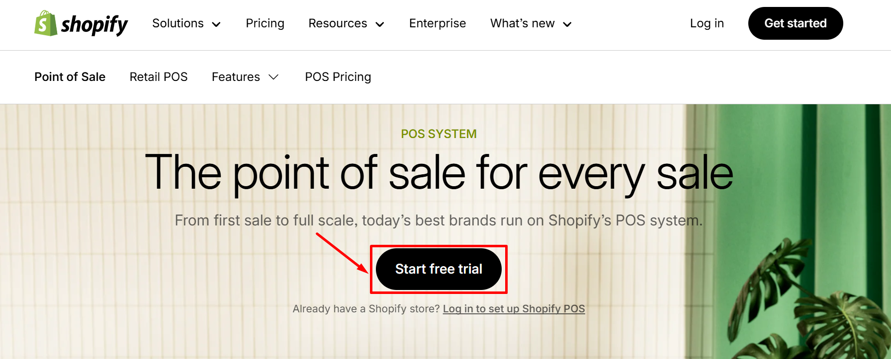 Click “Start Free Trial” to get started with Shopify’s free trial, which allows you to test out the POS features.