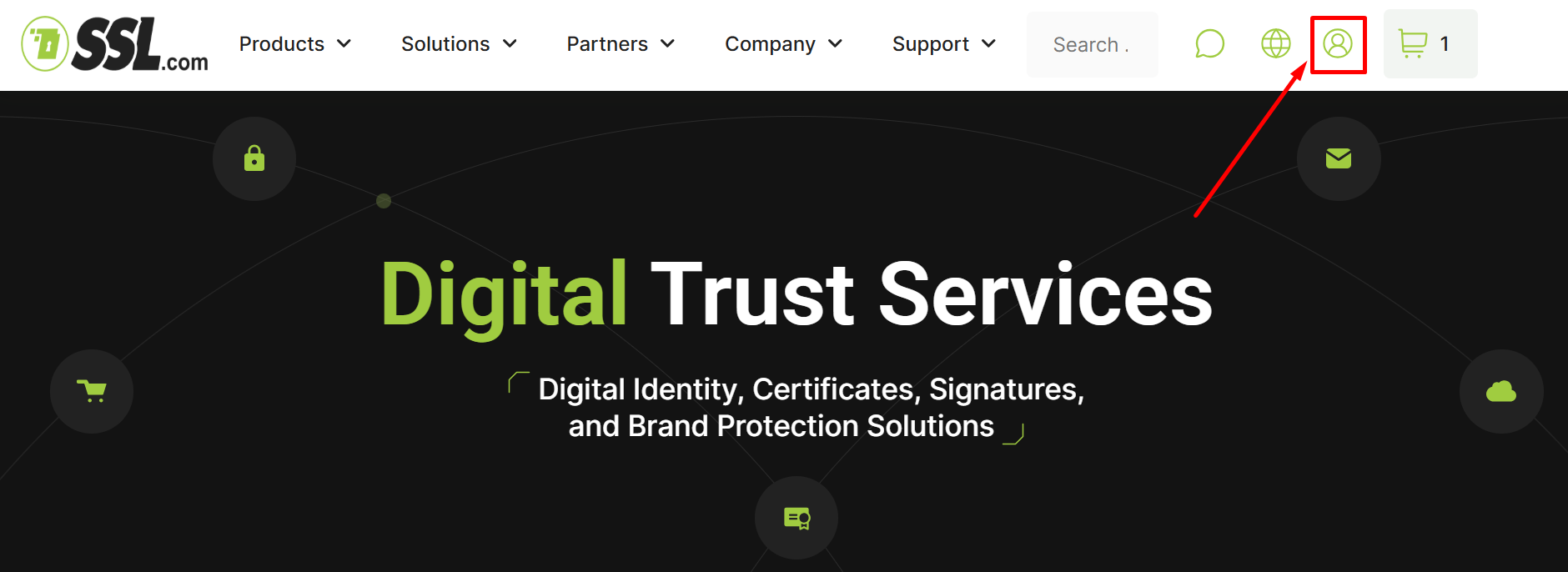 Step 1: Go to the official website of SSL.com and click on the user icon as shown in the image below.