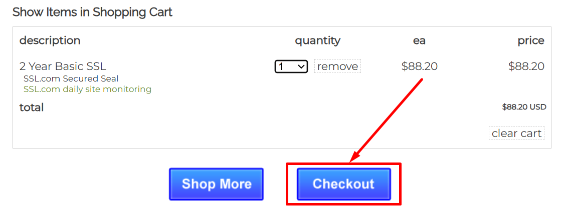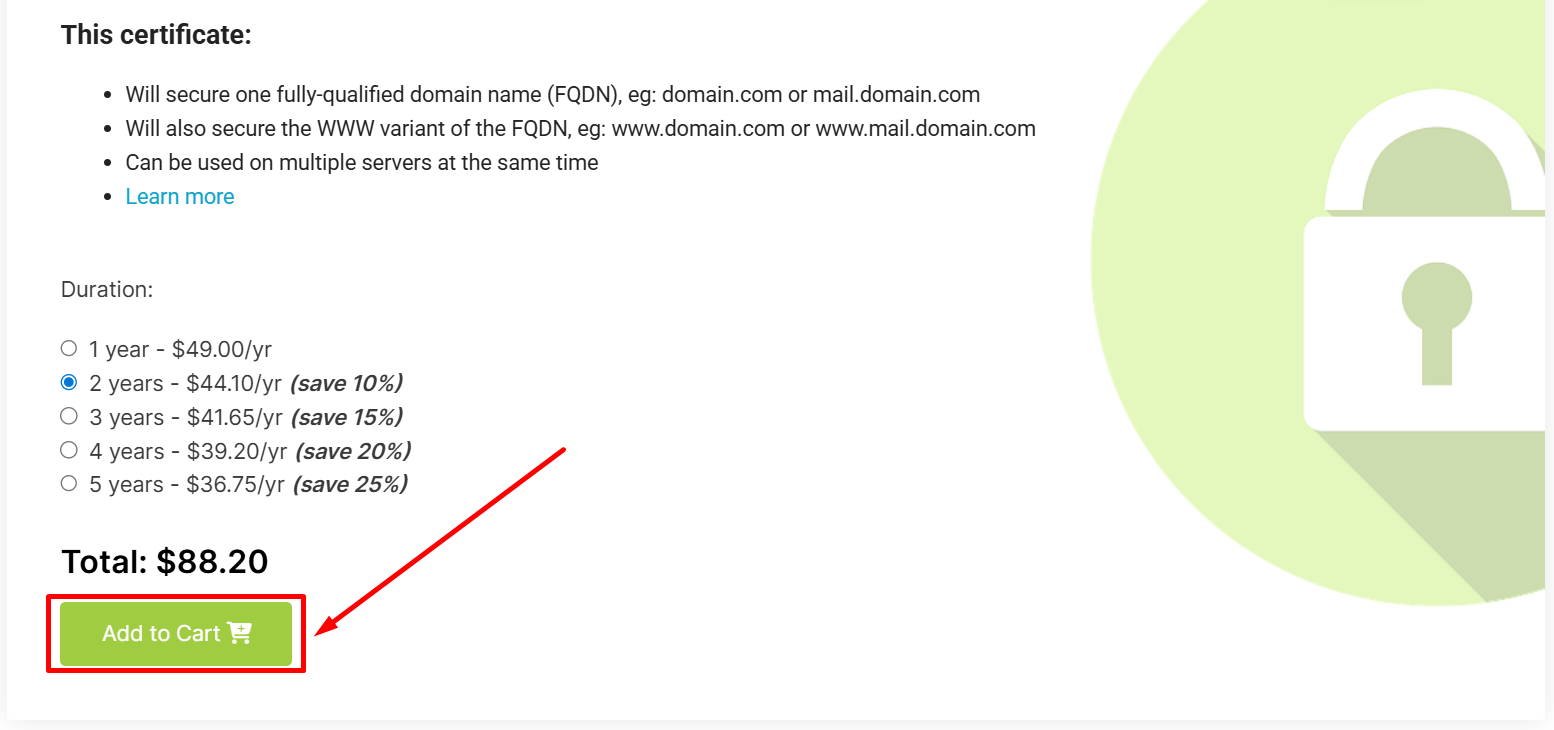 Step 5: Choose duration for how many years you want the subscription. After this click on “Add to Cart” and the SSL.com coupon code will be applied automatically at checkout.