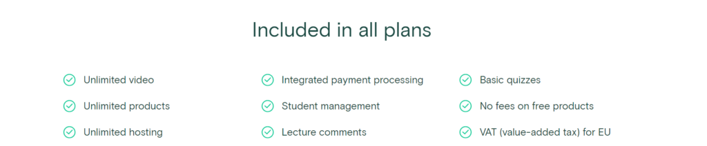 Free Plan – The plan does not cost anything. It offers all the core features, including Unlimited students, $1 + 10% per transaction, Instant payouts, Unlimited courses, Unlimited coaching services, Product bundles, Product support, Third-party integrations, Basic quizzes, Course design templates, 1 admin-level users, Student management, and Lecture comments.