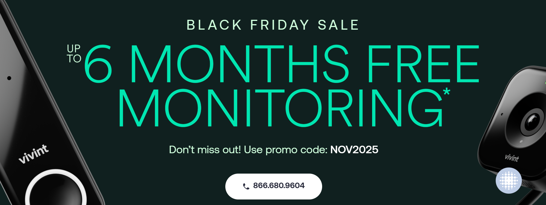 Secure your home with smart protection and real-time alerts from Vivint. This Black Friday, enjoy up to 6 months of free professional monitoring on qualifying systems. Smarter home, safer family – limited-time offer!